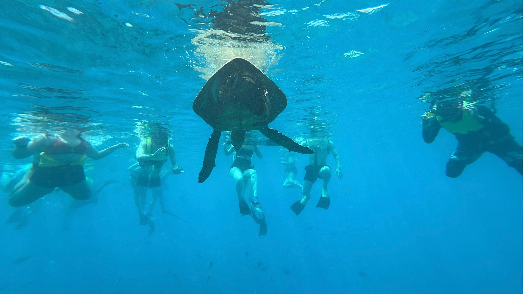 皆さん、アロ〜ハ!亀大学です。今日の1便は透明度がよく、あちこちで!というか、ひっきりなしに亀吉が水面に上がってくるくる!私達は、キャ〜!かわいいねえ〜♡ と大感動!その度に、カメラマンのブライアンは、亀吉を挟んで私達の反対側から、みんな〜シャカサインして〜!と、亀吉を入れて写真を撮ってくれる。亀吉が又水の中へ行ってしまうと、今度は、みんな〜下見て〜!と、水中からも写真を撮ってくれるの。泳いで動いて潜って写真を撮って… カメラマンは本当にすごいです!スリーピングエリアでは、真っ白な砂浜の所に7匹の亀がいた〜♡ ここでも、下まで潜って行ってパシャ!プロのカメラマンが撮るお写真、ツアーのいい思い出になりますよ。