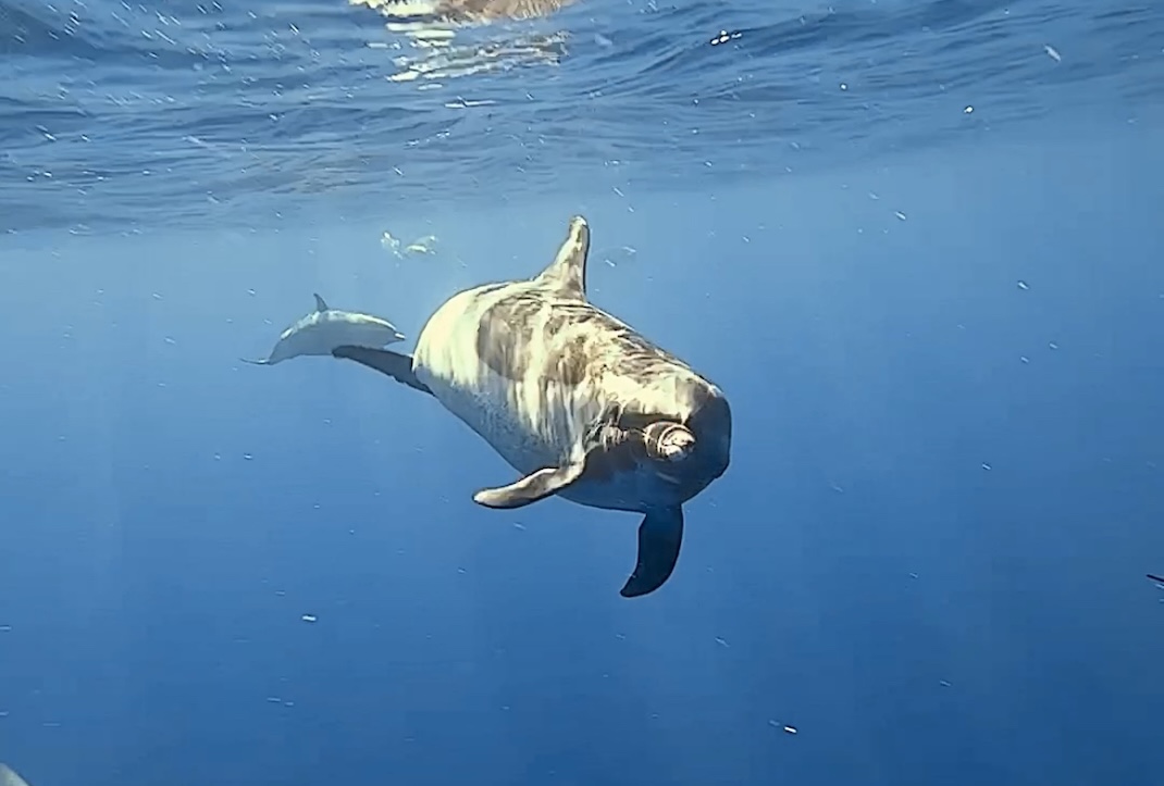 アロハ! 今日のイルカ大学ではマダライルカの大きな群れに出会いました。とても大きな群れで200頭は超えていたかな。船の周り360度にイルカたちがいるのでイルカ・ウォチングでも十分に楽しかったし、イルカ・スイムにチャレンジした生徒さんも水中で見るイルカに興奮していました。私も興奮した一人。だって、目と目が合うくらいイルカが間近に来てくれたのです!! あー、幸せ。。。。マハロ