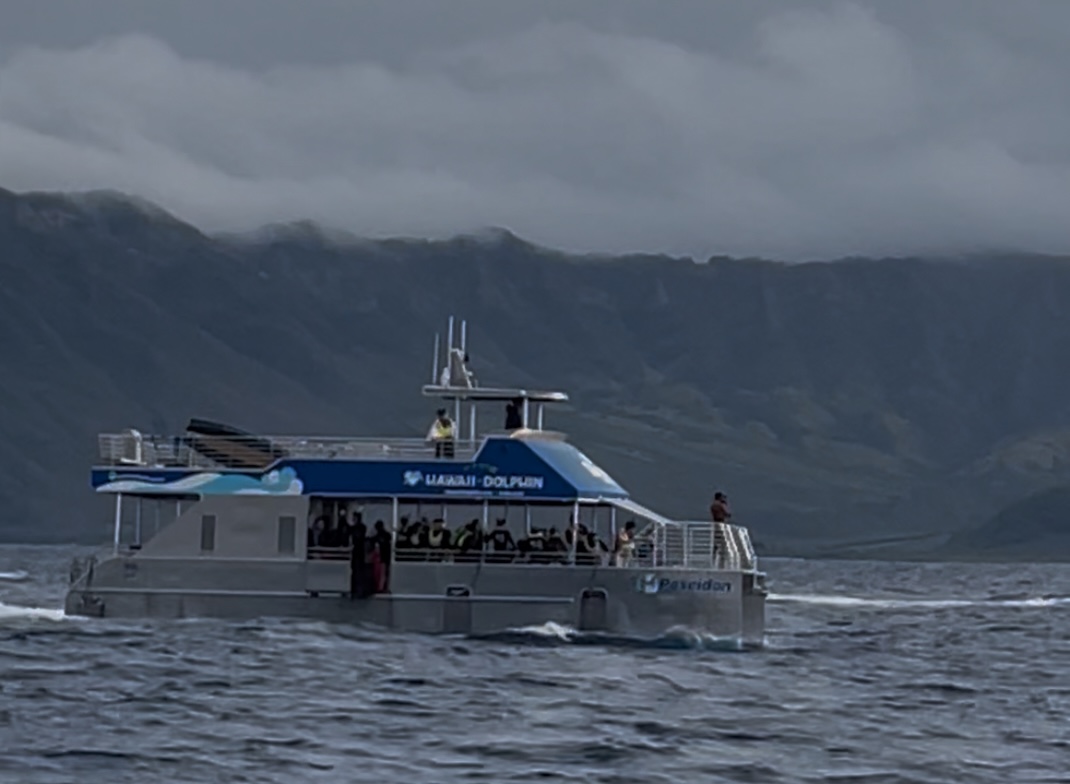オアフ西部のイルカたちが生活している海域はとても広いので、他のボートたちと協働してイルカを探します。誰かがイルカを見つけたら、皆んなに無線で伝えます。そう助け合いです。