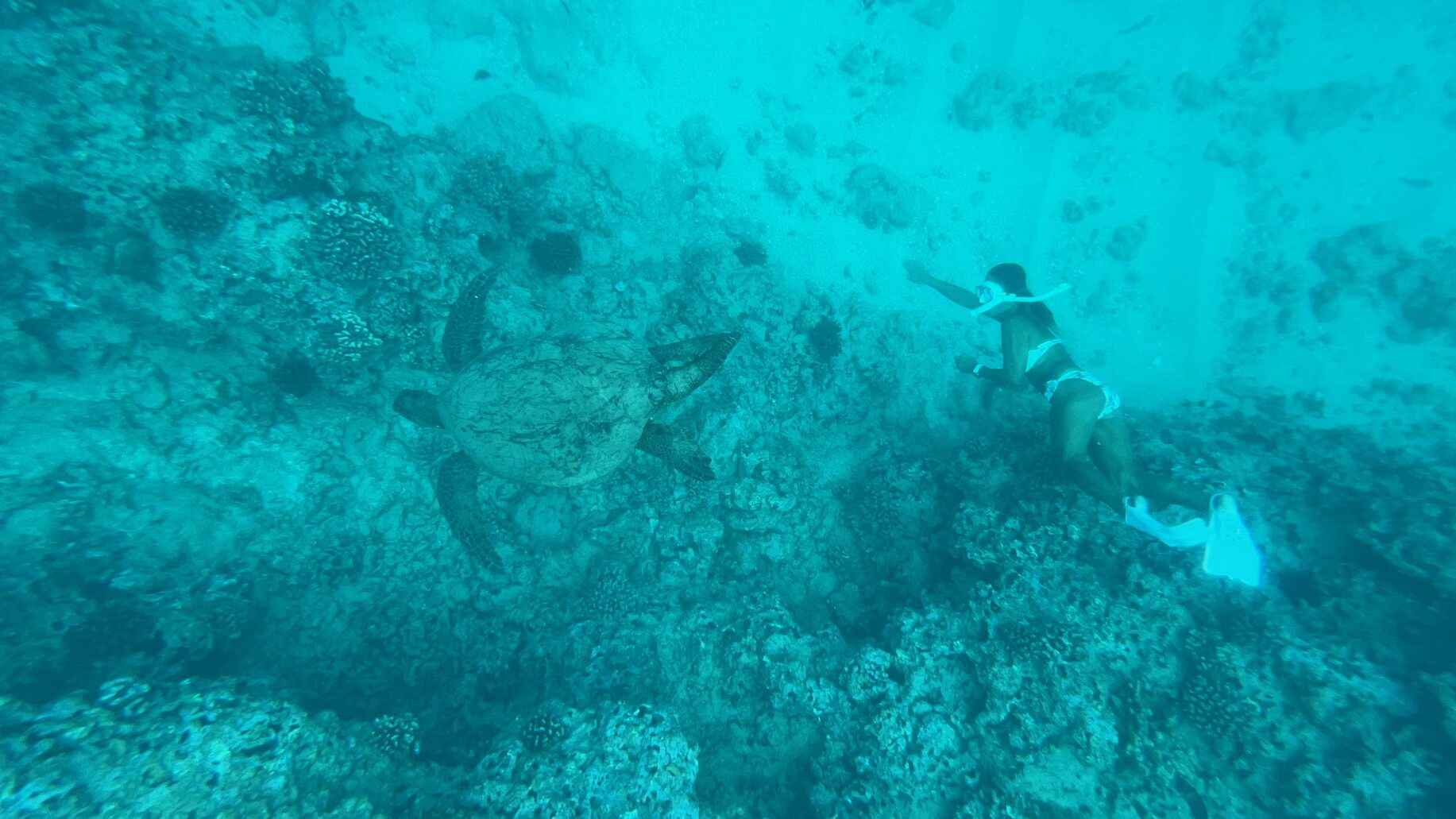 今日は1便でも2便でも、私がビックボスと名付けた、1番大好きなオスの大きな貫禄のある亀吉が、何度も現れてくれた〜♡ホルスの目で尻尾が長くて、タートルキャニオンの帝王って感じなの。この写真がそうです。ビックボスと私。身長158cmの私と比べても、大きいのが分かると思います。嬉しくって潜ってみました。まだまだ長生きしてねビックボス♡と強く念じてラブパワーを送り、投げキッスをして上がってきました。(笑) ほんと亀大学超最高です!