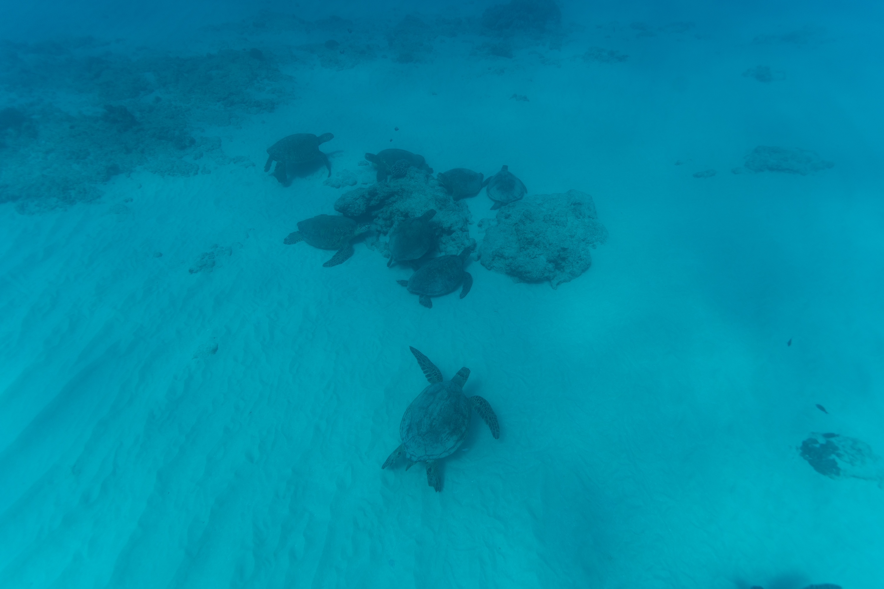 皆さん、アロ〜ハ!亀大学です。今日の1便は透明度がよく、あちこちで!というか、ひっきりなしに亀吉が水面に上がってくるくる!私達は、キャ〜!かわいいねえ〜♡ と大感動!その度に、カメラマンのブライア…