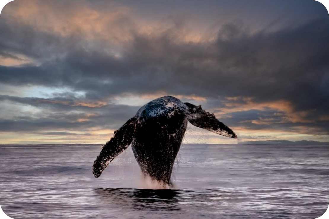 ホエールウォッチングで見られるクジラのパフォーマンスの中でも、誰もが一度は見たいと望むのが「ブリーチング」と呼ばれるジャンプです。いったん水中に潜ったクジラが水面に向かって勢いよく飛び出し、大きな水しぶきをあげながらジャンプする姿は圧巻です。ホエールウォッチングの際にブリーチングが見られる確率はシーズンを通して15〜20%と言われています。